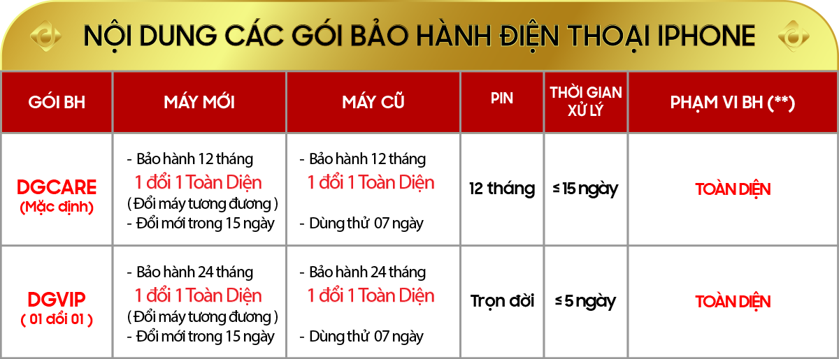 - Đối với iPhone : Mặc định bảo hành 12 tháng đối với lỗi NSX, khi nâng cấp gói BH DGVIP Digiphone hỗ trợ thay pin miễn phí trọn đời máy khi dung lượng dưới 80%, báo bảo trì hoặc pin hư, chai, phù sụt pin nhanh